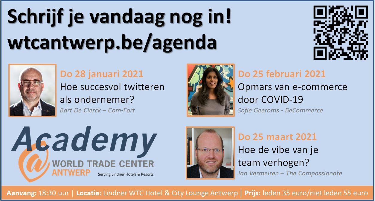 WTC Academy is alive & kicking! Na maandenlang hoopvol wachten organiseert WTC Antwerp in het najaar de keynotes met sprekers Jan Vermeiren, Chantal Smedts, Bart De Clerck en Sofie Geeroms. Van social media tot teamspirit en time management, het komt allemaal aan bod. Schrijf je snel in! www.wtcantwep.be/agenda